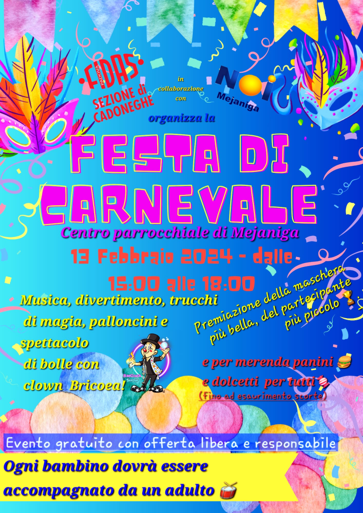 Festa di carnevale martedì grasso 13/2 ore 15,00-18,00 in Centro Parrocchiale